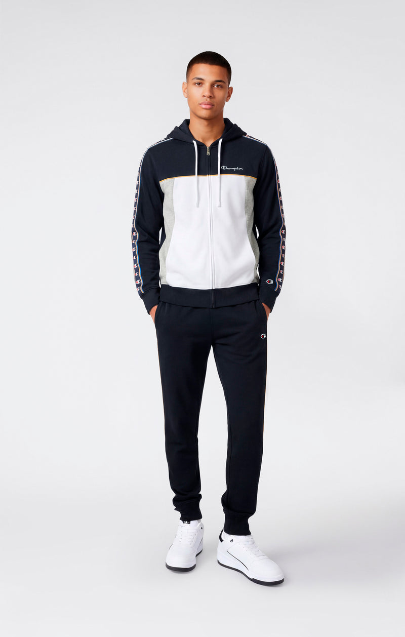 Herren-Trainingsanzug im markanten Sportswear-Look, ideal für Alltag und Freizeit. Gefertigt aus leichtem Basic-Terry-Material, bietet er angenehmen Tragekomfort und Atmungsaktivität für die Übergangszeit. Die Kapuzenjacke mit durchgehendem Reißverschluss wird durch eine passende Hose mit elastischem Bund ergänzt und ergibt ein praktisches, vielseitiges Set. Grafische Details und das Champion-Logo unterstreichen den Heritage-Stil der Marke.