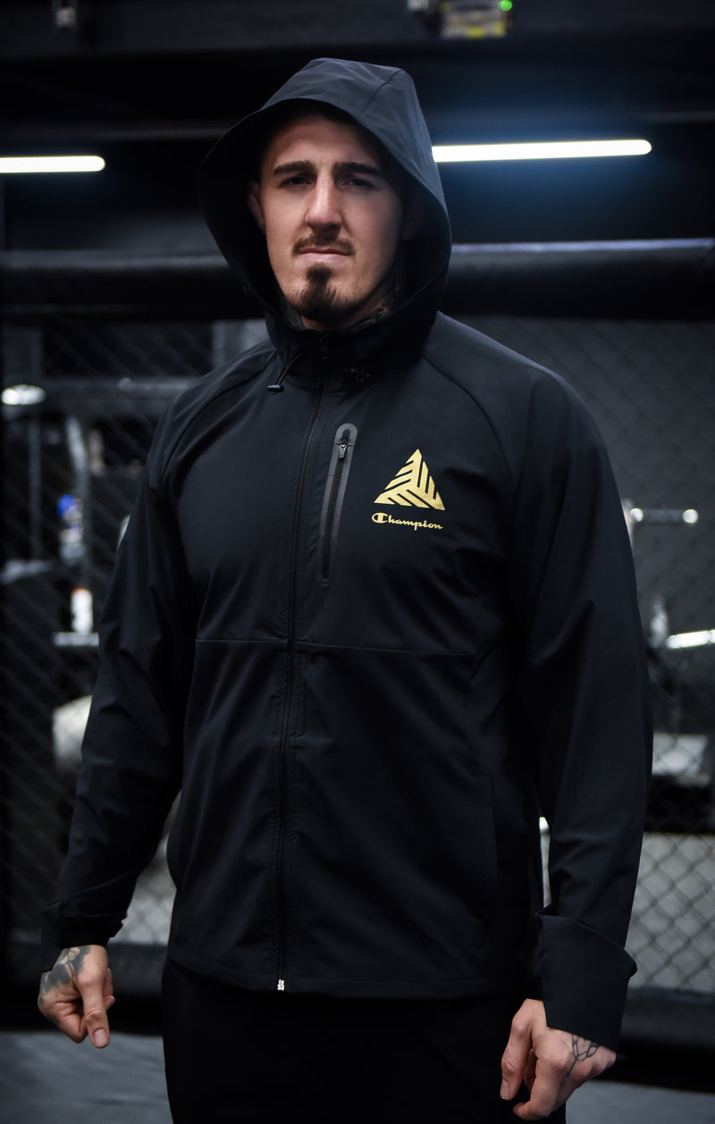 This hooded track top is the result of the exclusive collaboration between Champion and Tom Aspinall, blending performance, style, and a bold visual identity. Crafted from woven stretch fabric, it ensures comfort, durability, and full freedom of movement, adapting perfectly to the body thanks to its slim fit. The design features a range of functional details: ergonomic sleeves with an asymmetric construction (longer on top and elasticated underneath), a rounded hem for a dynamic silhouette, and a heat-sealed chest pocket that adds a clean, technical finish. But it’s the back graphic that truly stands out: a striking gold print inspired by one of Tom Aspinall’s personal tattoos — a symbol of protection rooted in Japanese artistic tradition — turning the garment into a powerful visual statement of strength, focus, and fighter spirit. The front branding celebrates the meeting of two worlds: the relentless athlete and the legacy of Champion sportswear.