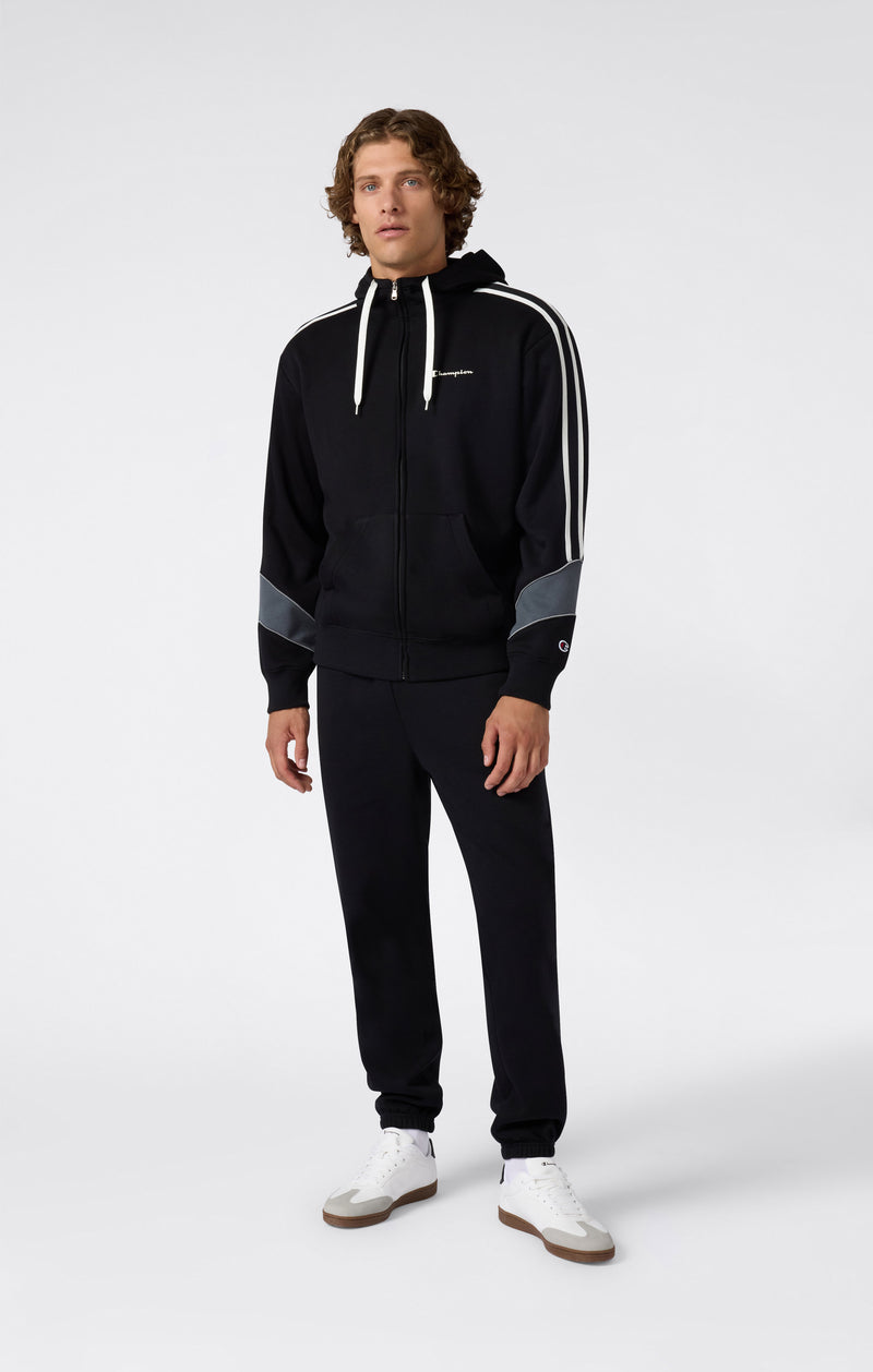 Full-zip tracksuit with hood featuring a sporty, contemporary look. Made from soft cotton-blend fleece, it delivers comfort and style for any occasion. Contrast details on sleeves and legs add a dynamic touch to the design.