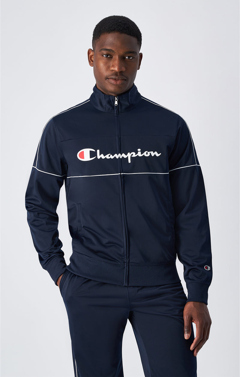 Questa tuta da uomo dalla vestibilità Regular Fit è realizzata in tessuto lucido leggero. Dotata di chiusura con cerniera su tutta la lunghezza, è inoltre rifinita con profili a contrasto e con il logo Champion sul petto.