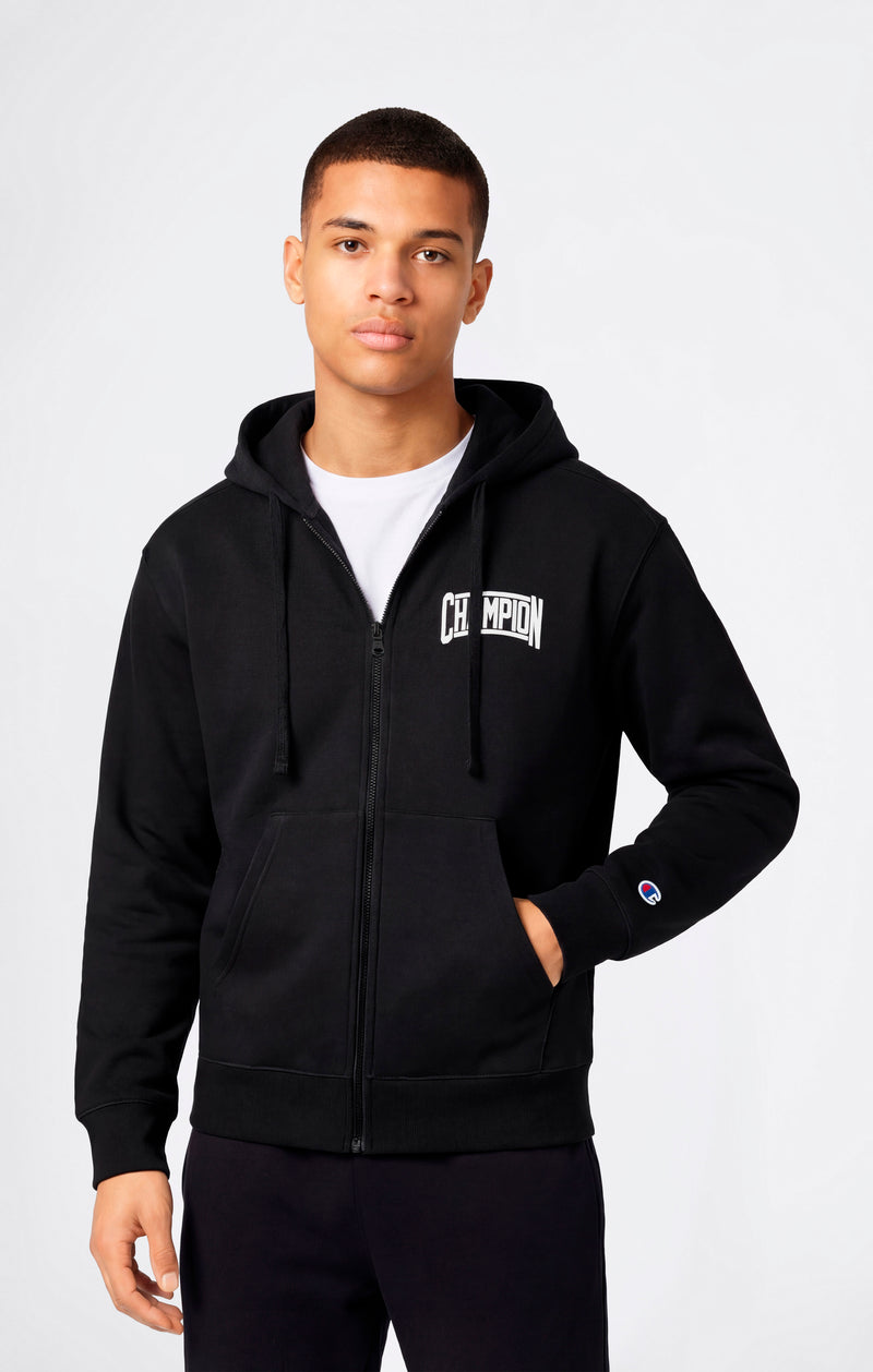 Men’s hooded full zip sweatshirt that expresses a collegiate aesthetic reworked with a contemporary street attitude. The maxi Champion logo, featured on both the chest and back, is created using puff print, a printing technique that produces a subtle raised effect, adding depth and character to the design. The solid construction and clean look make the garment versatile and modern. Made from compact fleece fabric, it delivers warmth and comfort for everyday wear. The Relax Fit creates a soft, laid-back silhouette, ideal for leisure time and urban life.