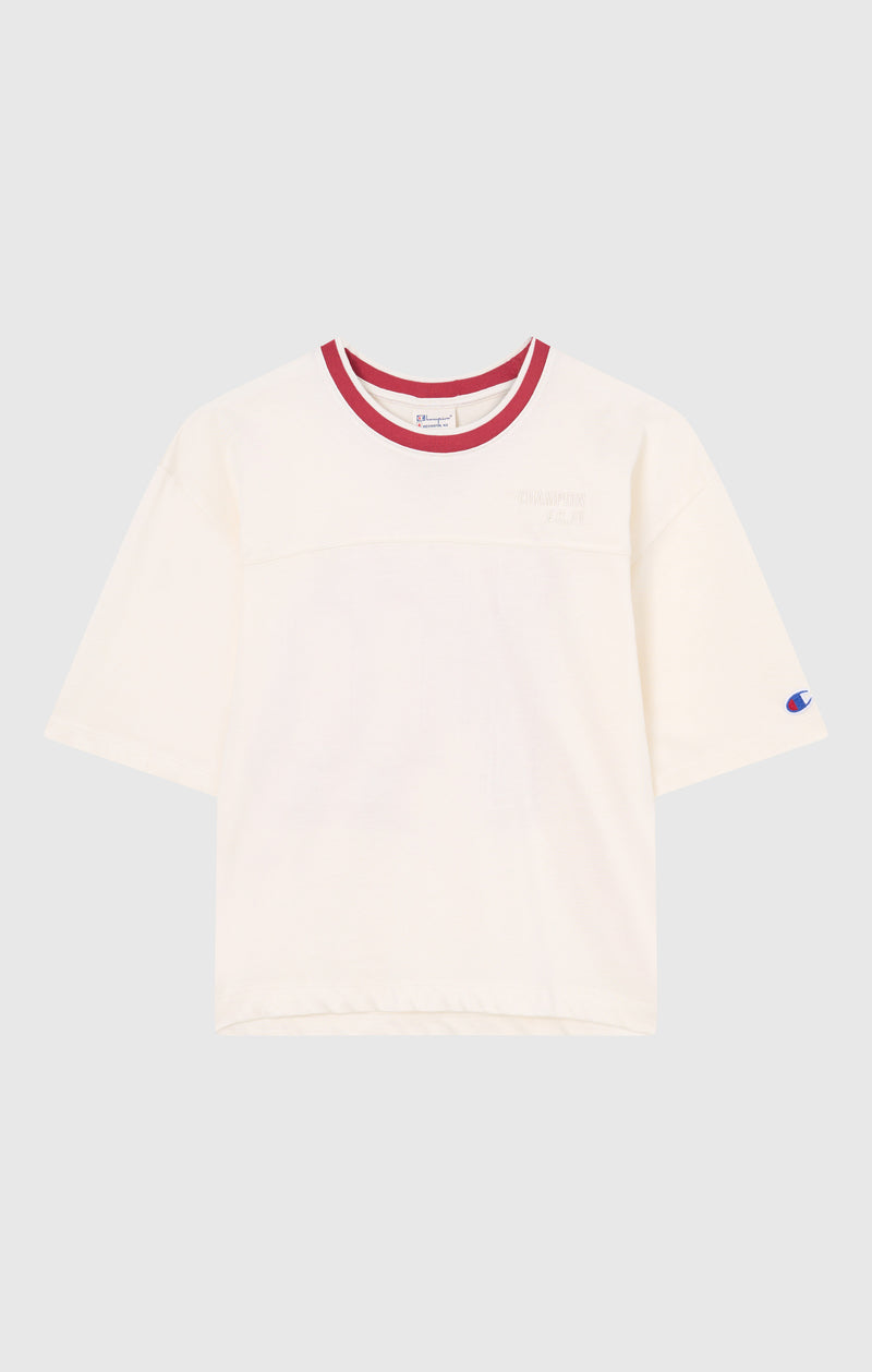 This women’s crewneck T-shirt features a design inspired by classic sports aesthetics, with a number graphic applied on the back and contrasting details on the front. The style draws from Champion’s Sport Heritage roots, reinterpreting football-inspired codes through non-technical materials and a contemporary approach. Made from lightweight jersey in a viscose and cotton blend, it offers a soft feel and comfortable structure, while the Standard Fit ensures everyday wearability.