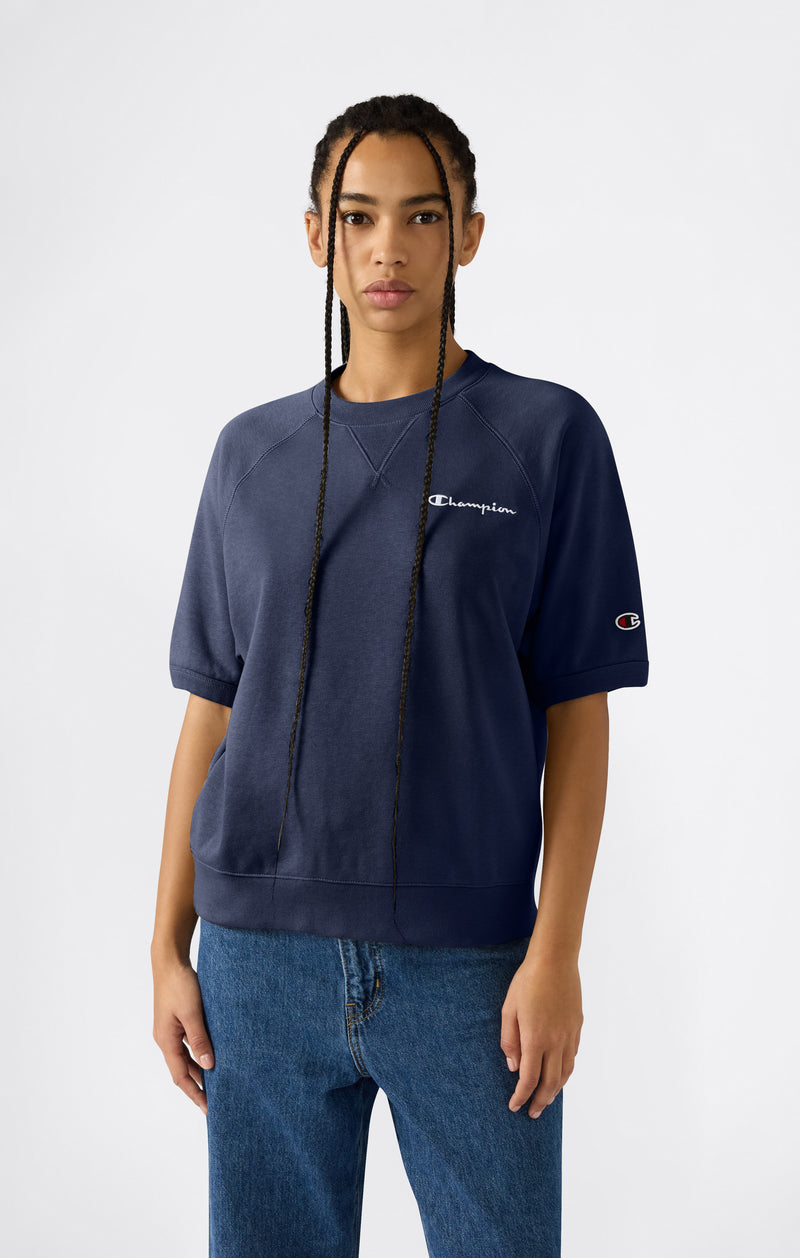This women’s lightweight short sleeve crewneck sweatshirt is made from terry fabric, ideal for everyday wear and transitional seasons. The short sleeve design makes it versatile and easy to style, while the contrast Champion logo on the chest adds a recognizable detail. The Standard fit ensures comfort and freedom of movement.