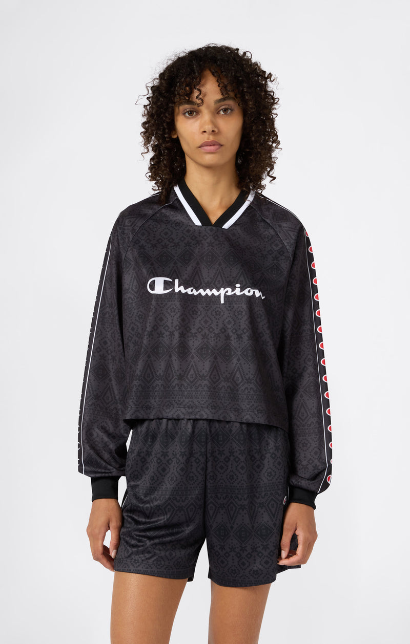 This long-sleeve V-neck top draws inspiration from ’90s American football jerseys, reinterpreted with a bold lifestyle edge. Made from lightweight, breathable interlock, it features an all-over print, logo tape on the sleeves and a front Champion logo. Perfect for sporty layered looks or bold standout outfits.